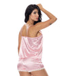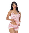 Pijama de dos piezas compuesta por blusa de tiras delgadas y short cómodo de silueta suelta. La blusa presenta un delicado escote con detalle en encaje que aporta un toque romántico y femenino. El short cuenta con pretina elástica que se ajusta suavemente al cuerpo, brindando comodidad y libertad de movimiento para descansar con total confort.