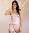 Conjunto de pijama con blusa de tiras y escote redondo con delicado detalle en encaje, perfecto para sentirte fresca y cómoda durante la noche. Su diseño ligero y femenino se ajusta suavemente al cuerpo, brindando libertad y suavidad al descansar.