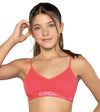 Top acostumbrador juvenil sin aro, sin realce, con escote en "V" y copas removibles. Ideal para bustos pequeños. Se ajusta perfectamente a su cuerpo y su material es suave y fresco. Cuenta con abrochadura en la espalda y tiras ajustables. Su tejidos son de alta calidad y resistencia